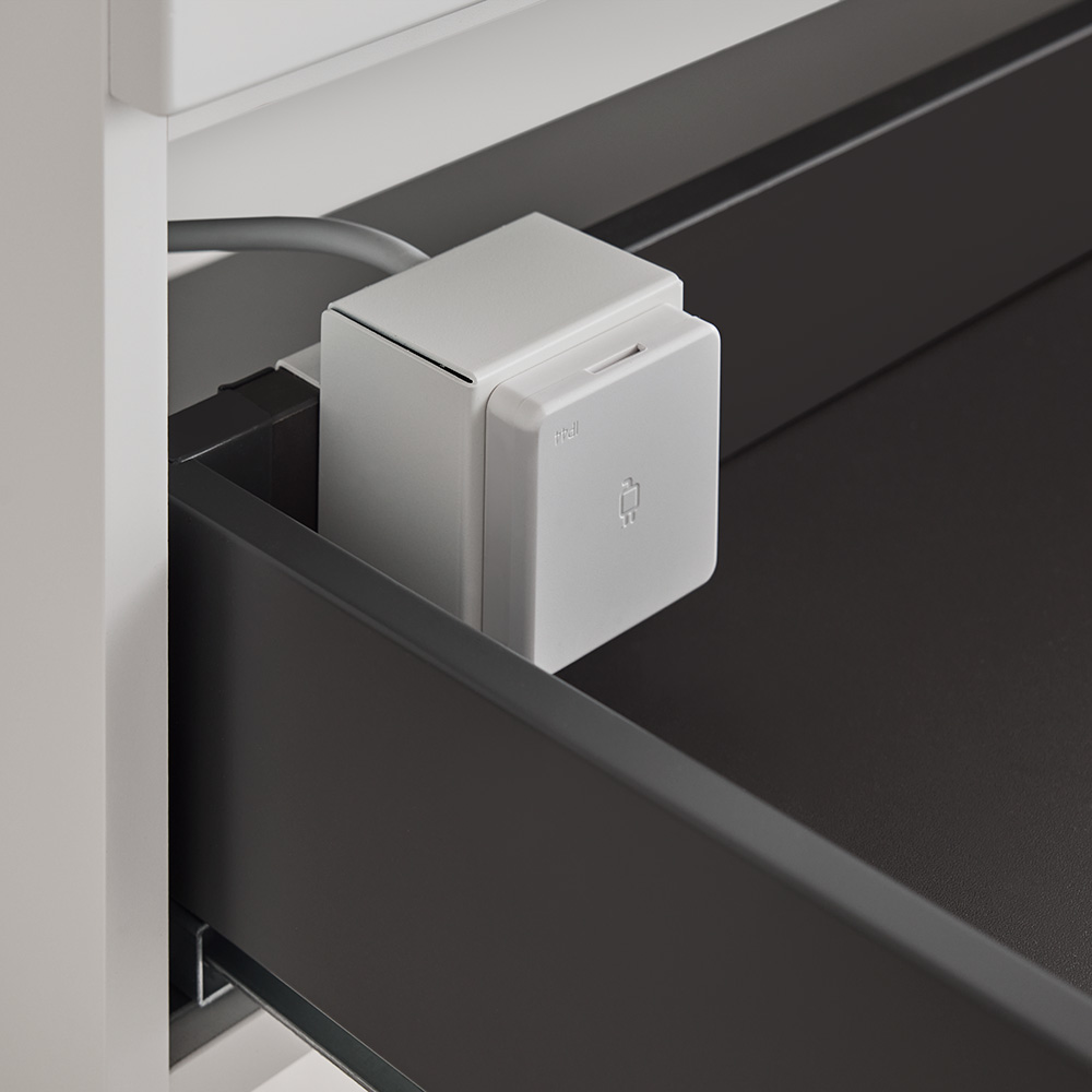 This practical socket makes it easy to connect appliances such as an electric toothbrush or hairdryer inside the vanity unit. The socket can be easily disconnected when required, for example when the drawer needs to be removed for cleaning the waste trap.