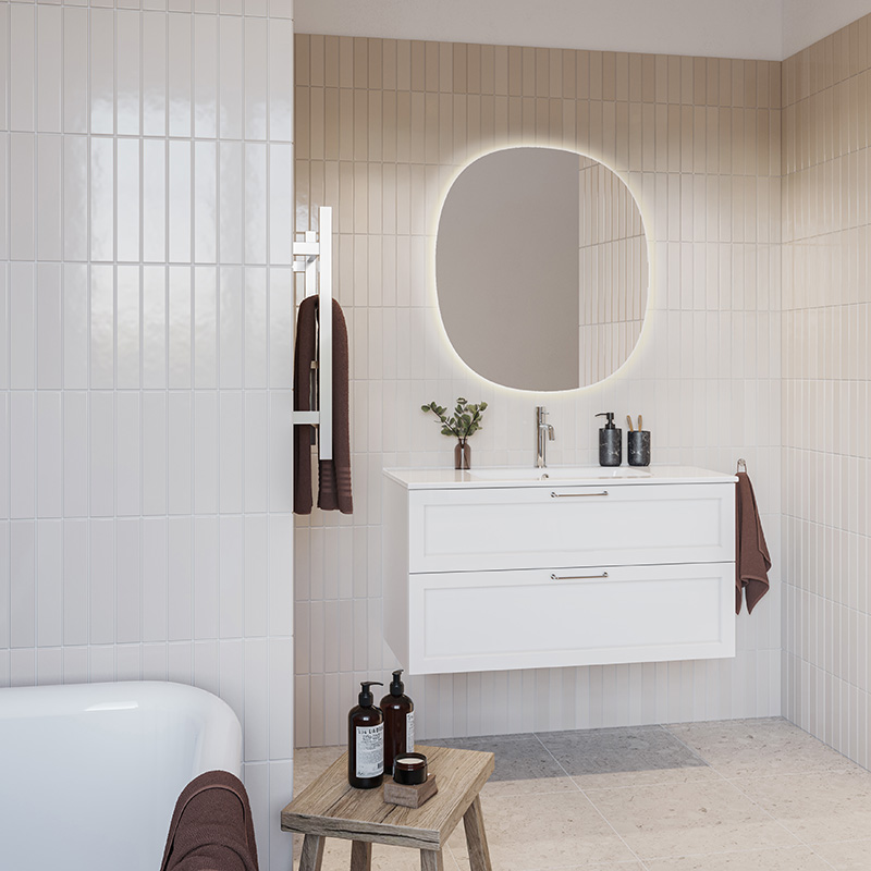 Westerberg's Aura mirror with lighting adds a soft and organically rounded shape to your bathroom that creates harmony. Behind the mirror, a warm white light spreads out and fills the room with a warm, inviting glow that spreads a calm and pleasant atmosphere.