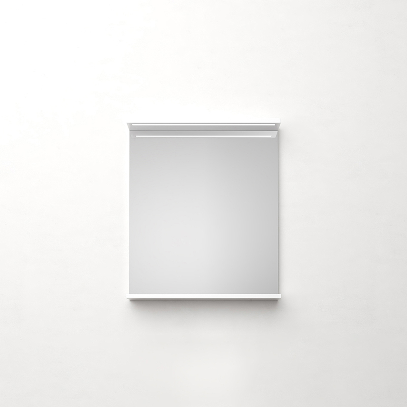 Mirror with functional lighting and recessed LED profile with warm white light. Practical shelf for storage. Easy installation for one person with adjustable suspension bar. Prepared for electrical installation. IP24.