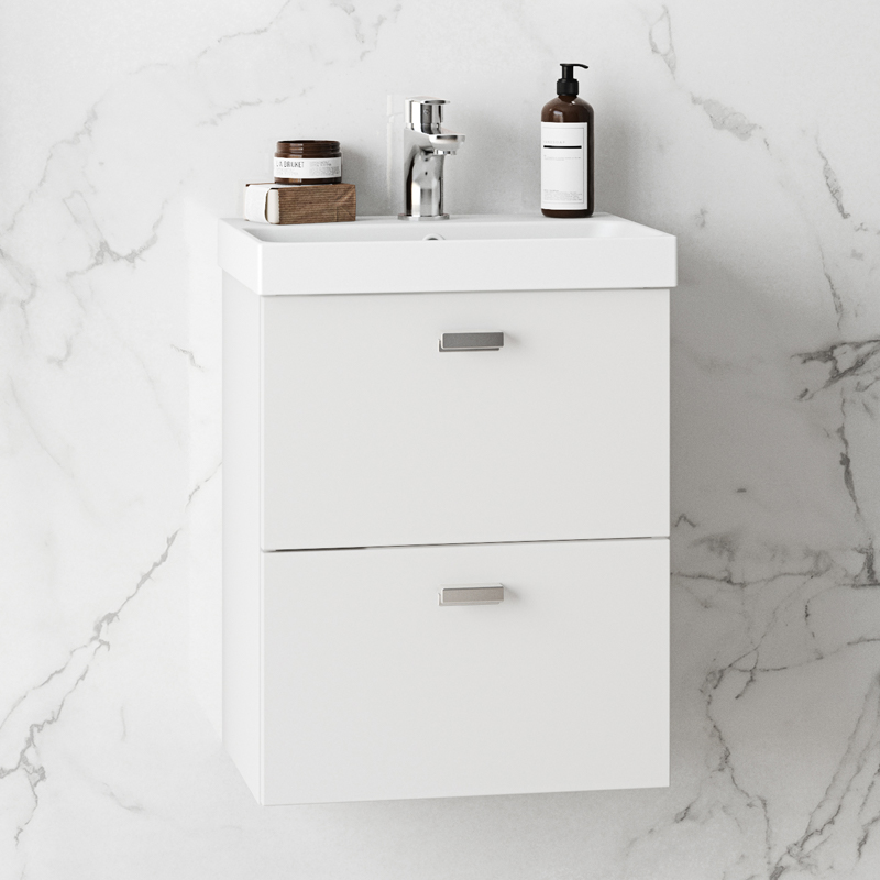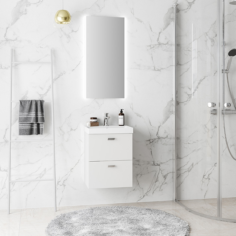 Under cabinet with soft close doors and a height adjustable shelv. Easy mounting with complete wall rail and adjustable suspension brackets. The furniture is prepared for both floor- and wall waste. Complement with basin and handles/knobs.