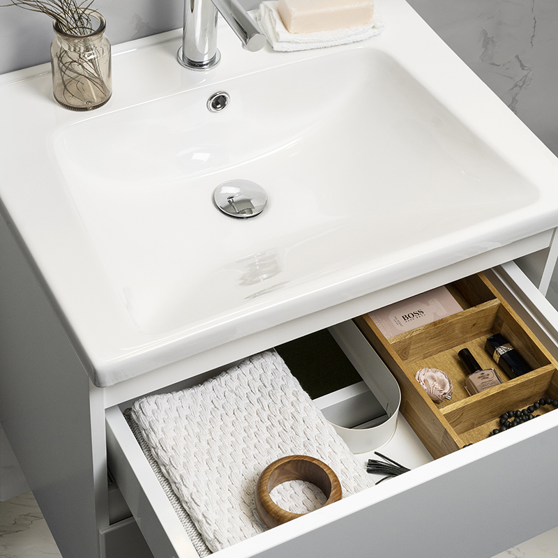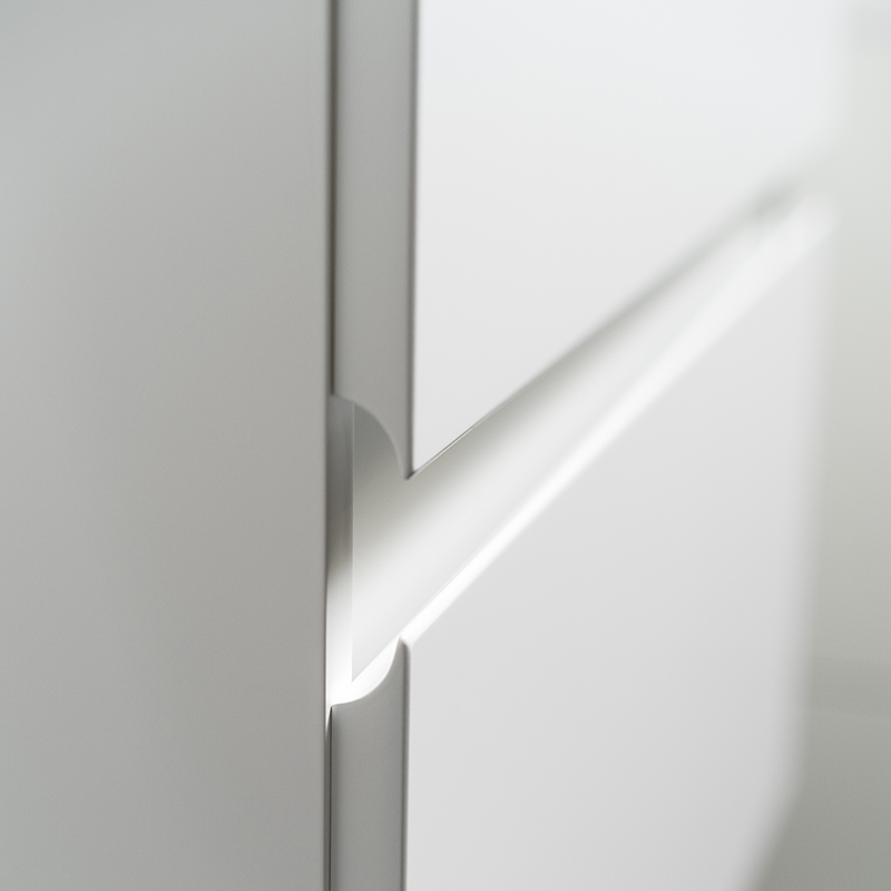 Himmel is a stylish bathroom under cabinet with soft-closing drawers with integrated handles. The drawers have full pull-outs and drawer sides made of metal. A removable mat at the bottom of the drawers keeps things in place and makes it easier to clean. The upper drawer has a U-shape that leaves space for water traps. The furniture is prepared for both floor and wall drains and has adjustable hanging fittings. Available in white matte and anthracite. Purchase for water trap.