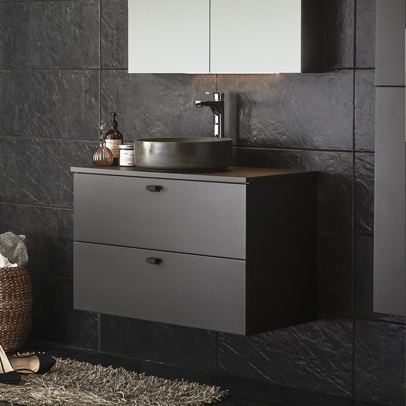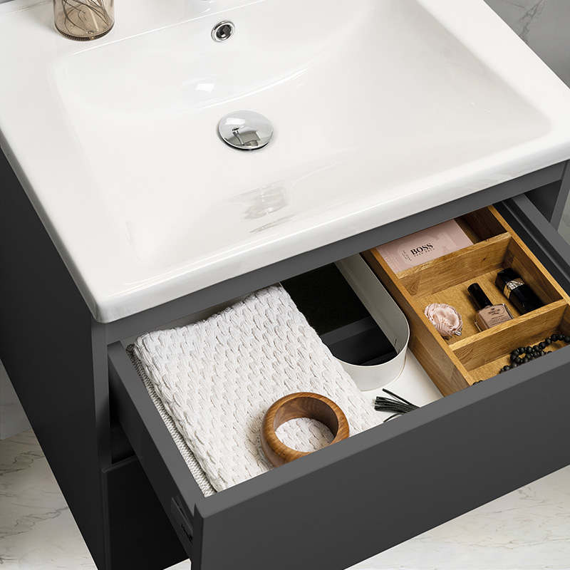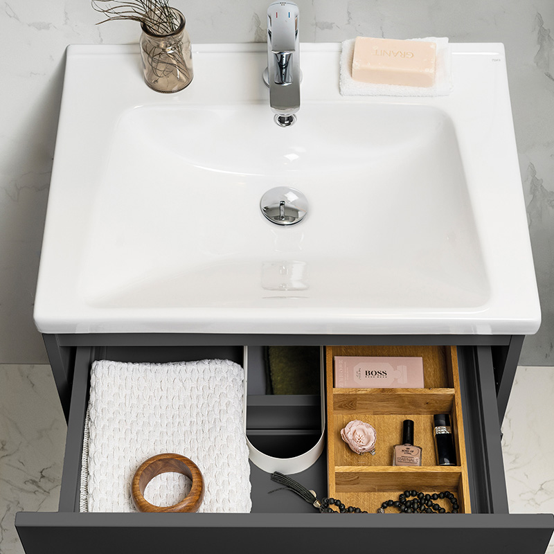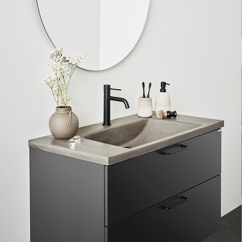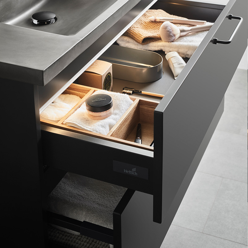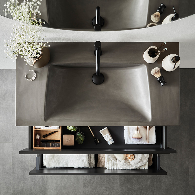 Soft-closing drawers with full extension and drawer sides made of metal. A removable mat at the bottom of the drawers keeps things in place and makes cleaning easier. The upper drawer has a U-construction that leaves room for water traps. The furniture is prepared for both floor and wall drains and has adjustable suspension fittings.