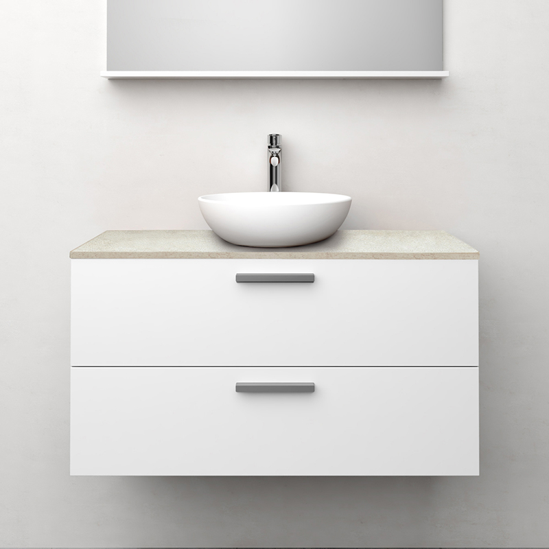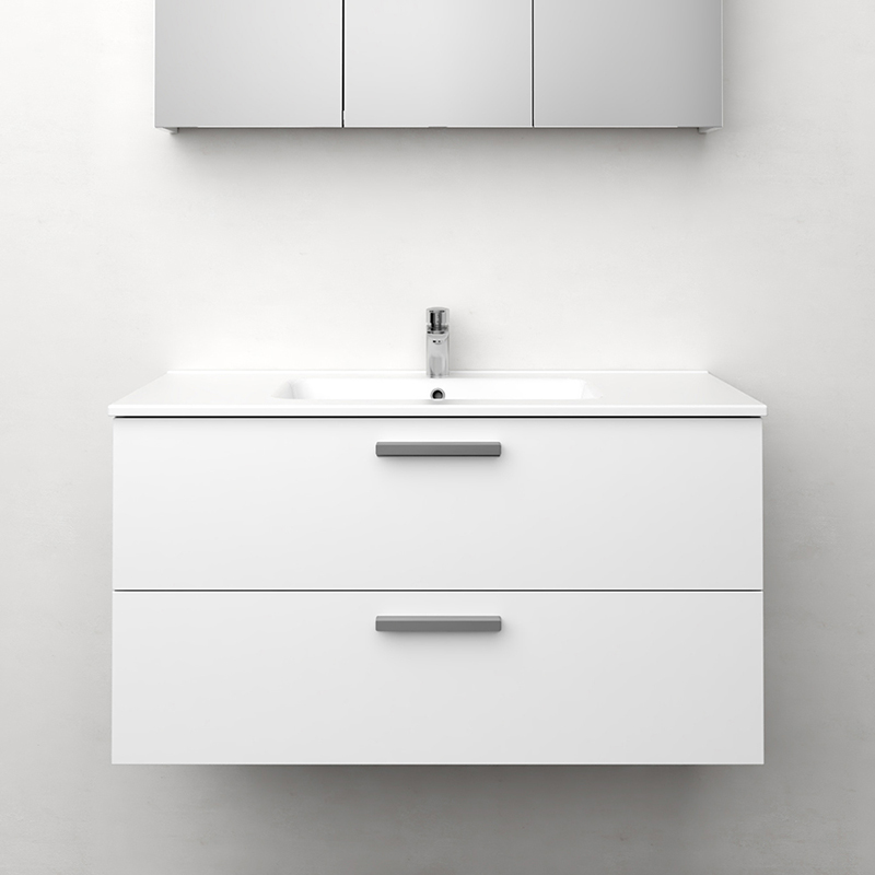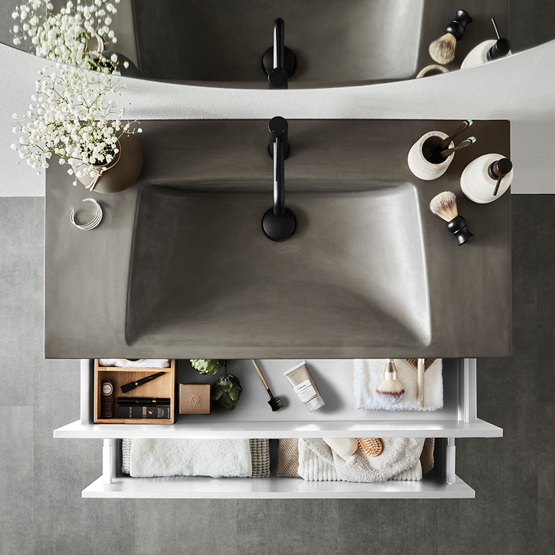 Soft-closing drawers with full extension and drawer sides made of metal. A removable mat at the bottom of the drawers keeps things in place and makes cleaning easier. The upper drawer has a U-construction that leaves room for water traps. The furniture is prepared for both floor and wall drains and has adjustable suspension fittings.