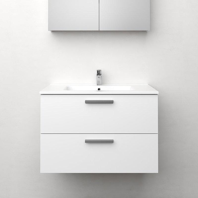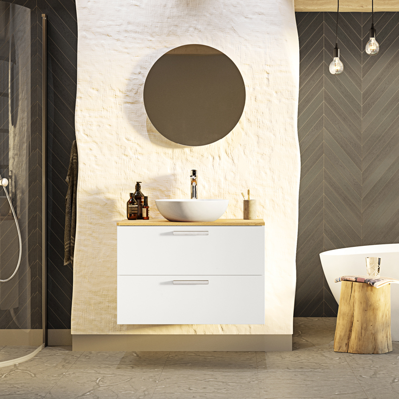 Soft-closing drawers with full extension and drawer sides made of metal. A removable mat at the bottom of the drawers keeps things in place and makes cleaning easier. The upper drawer has a U-construction that leaves room for water traps. The furniture is prepared for both floor and wall drains and has adjustable suspension fittings.