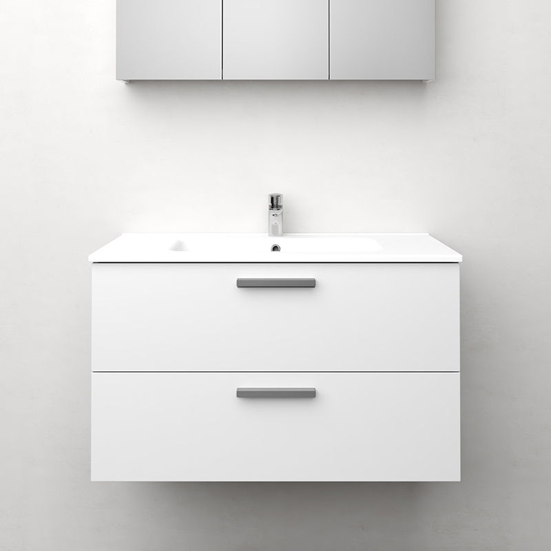 Soft-closing drawers with full extension, drawer sides made of metal. A removable mat at the bottom of the drawers keeps things in place and makes cleaning easier. The upper drawer has a U-construction that leaves room for water traps. The furniture is prepared for both floor and wall drains and has adjustable suspension fittings.