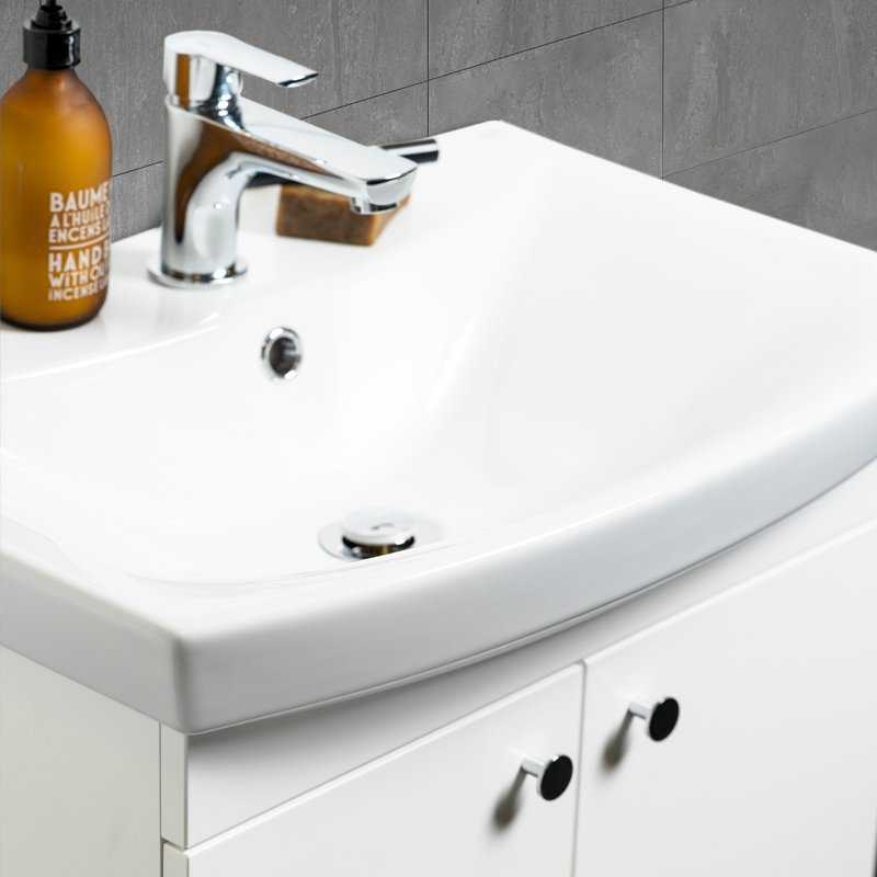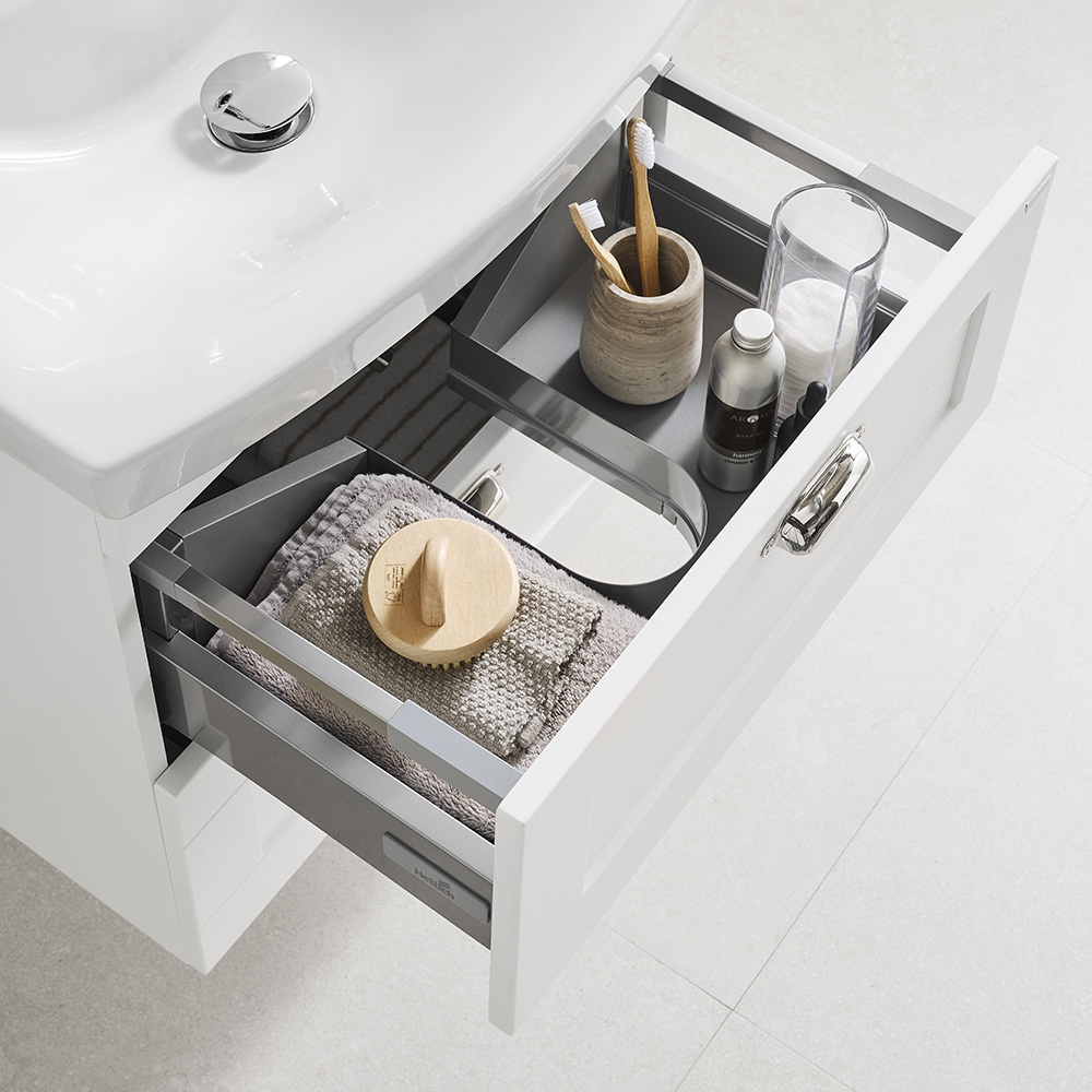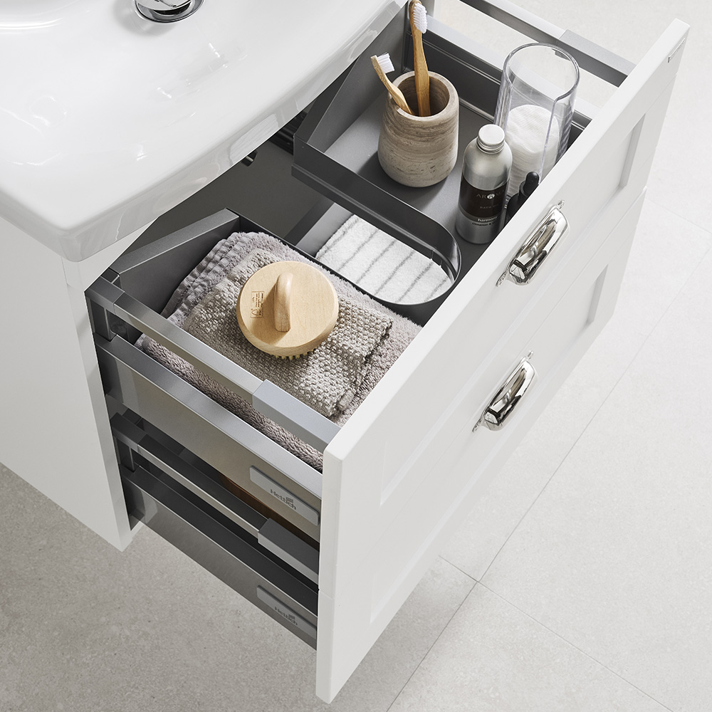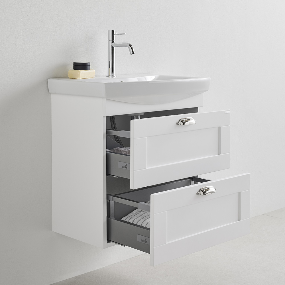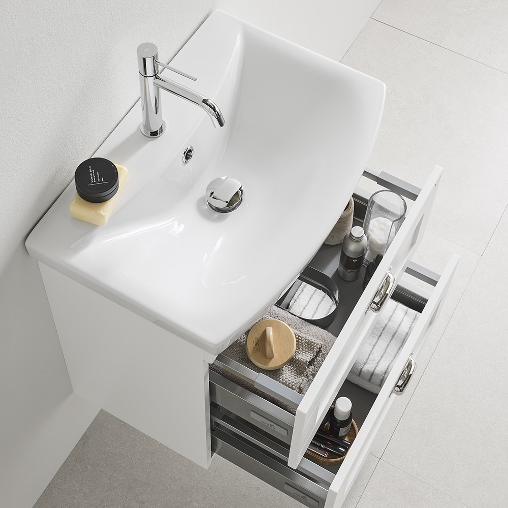 Basin vanity unit with two soft-closing drawers. The upper drawer is equipped with a U-construction that leaves room for water traps. Prepared for both floor and wall drains. Adjustable suspension brackets. Delivered pre-assembled. Complete with washbasin and handle / knobs.