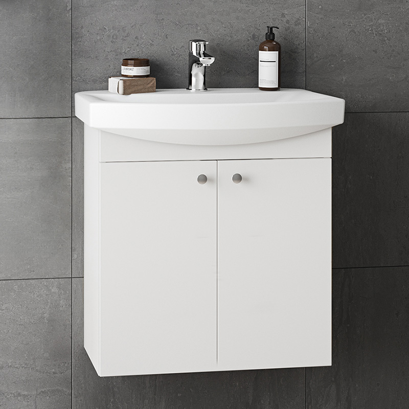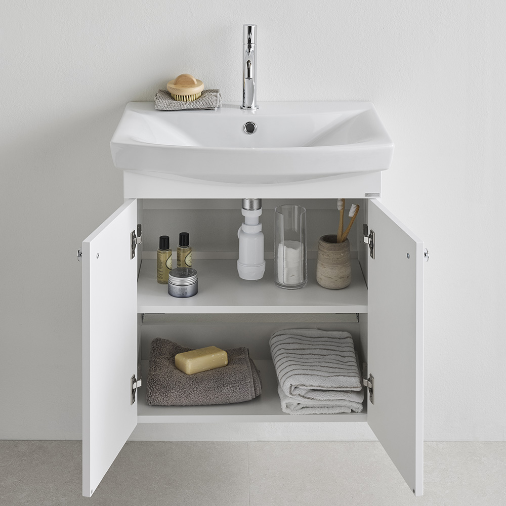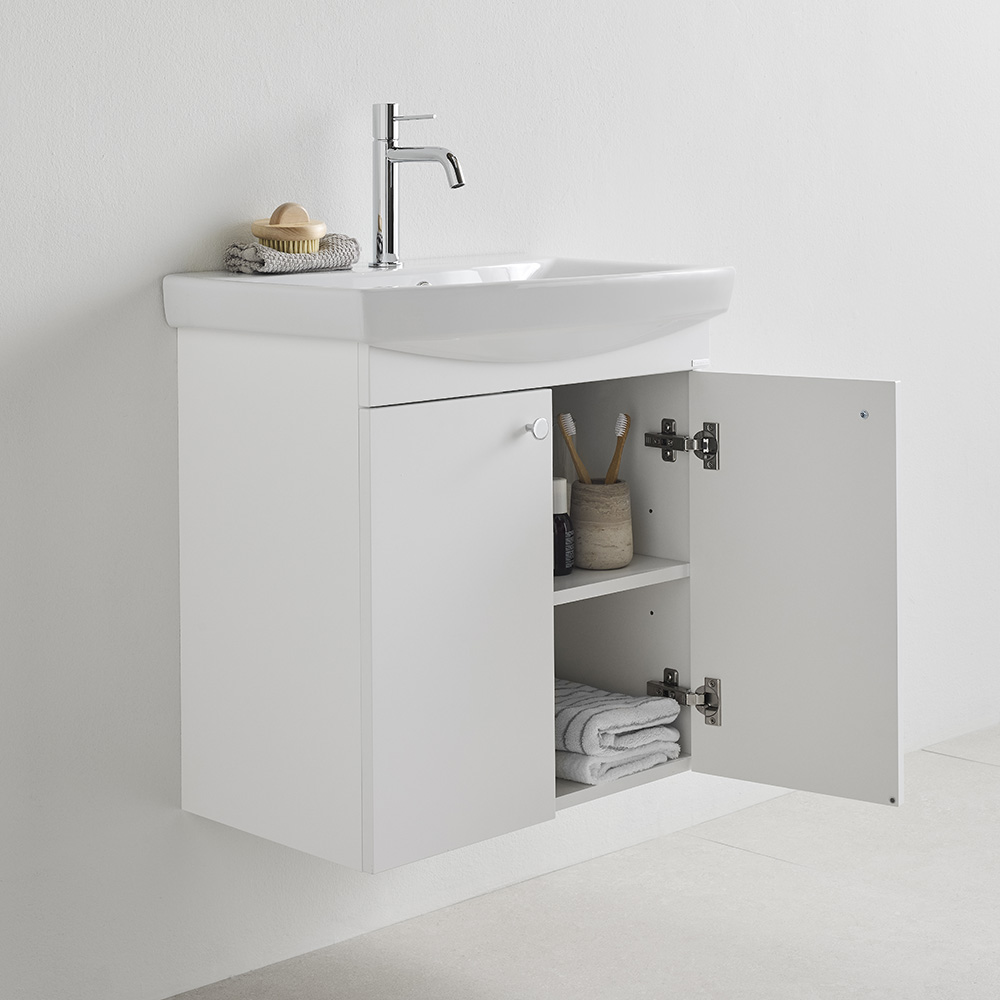 Basin vanity unit with two soft-closing doors and a movable shelf. Prepared for both floor and wall drains. Adjustable suspension brackets. Delivered pre-assembled. Complete with washbasin and knob.
