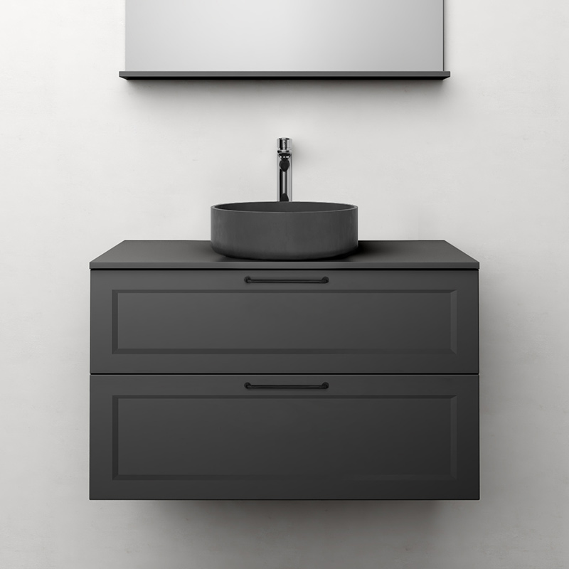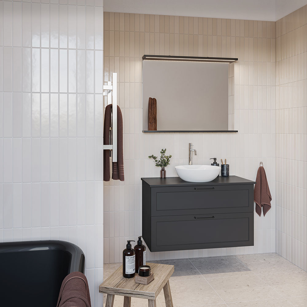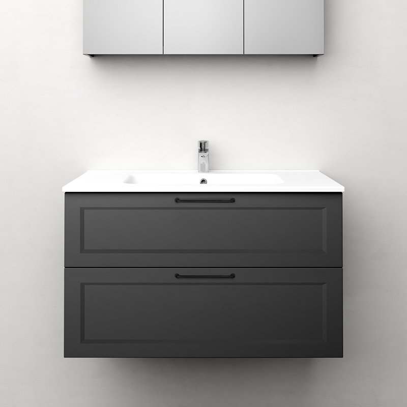 Nejd is a classic style bathroom furniture with fronts with frames. Soft close drawer with full pull out and drawer sides of metal. The mat hols things in its place and can be removed for easy cleaning. Upper drawer has a U-construction, enabling space for The waste trap. The furniture is prepared for both floor- and wall waste and has adjustable suspension brackets. Comes in white matt and anthracite. We recommend waste trap 200 720 00 that is very slim and leaves much room within The drawer. Complement with handles.