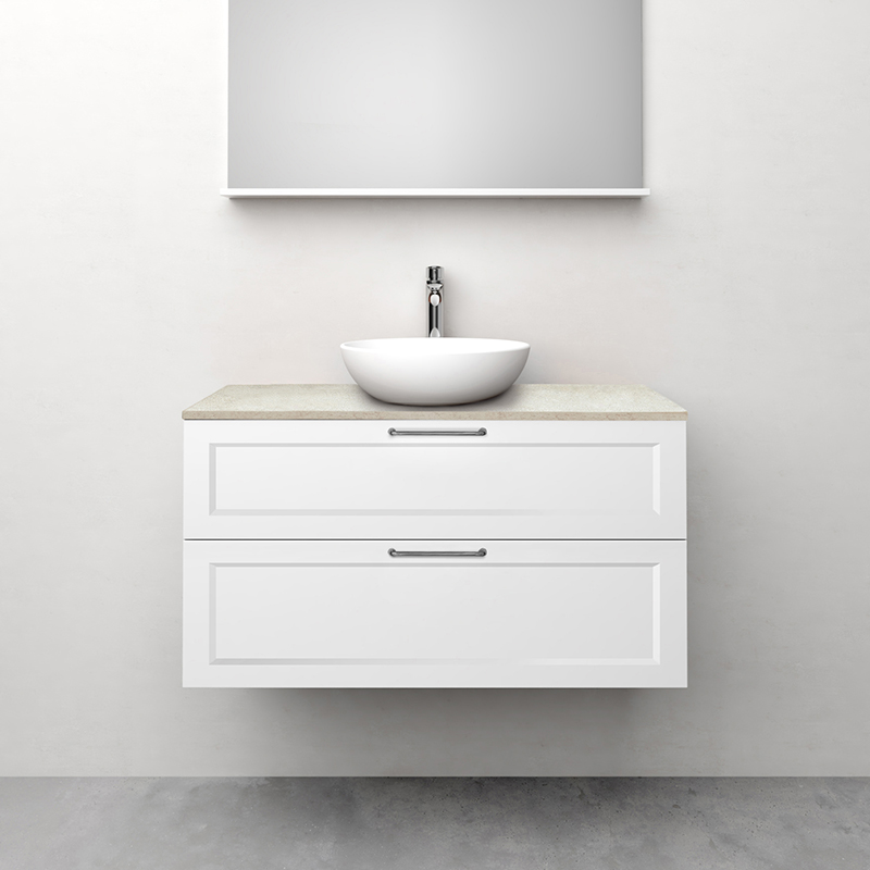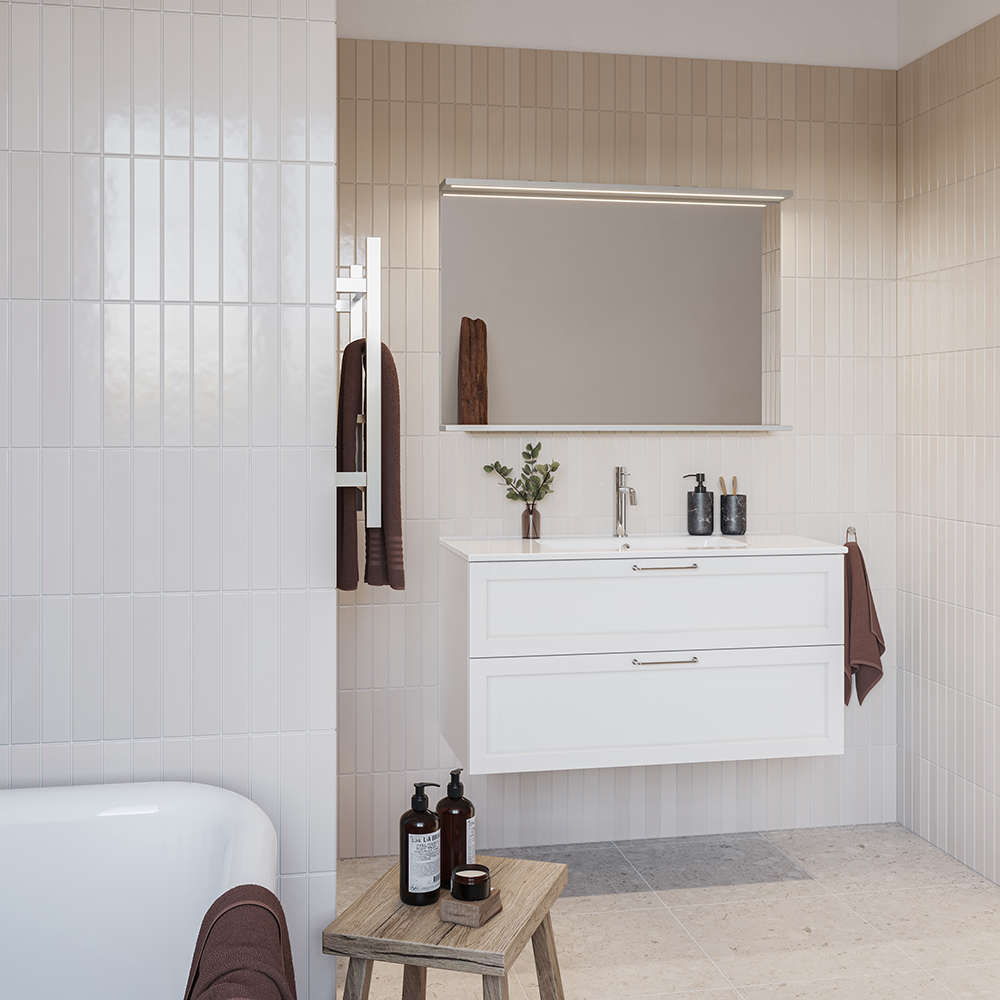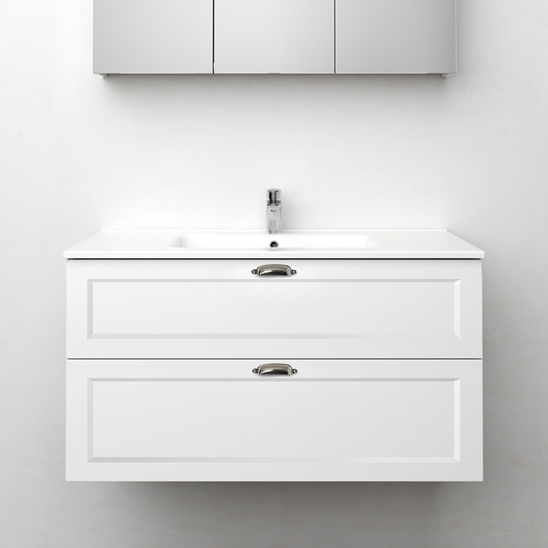 Nejd is a classic style bathroom furniture with fronts with frames. Soft close drawer with full pull out and drawer sides of metal. The mat hols things in its place and can be removed for easy cleaning. Upper drawer has a U-construction, enabling space for The waste trap. The furniture is prepared for both floor- and wall waste and has adjustable suspension brackets. Comes in white matt and anthracite. We recommend waste trap 200 720 00 that is very slim and leaves much room within The drawer. Complement with handles.