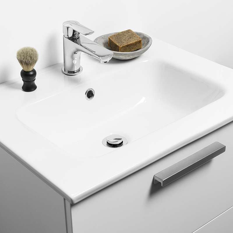 Thin, spacious washbasin in porcelain with storage areas on the side.