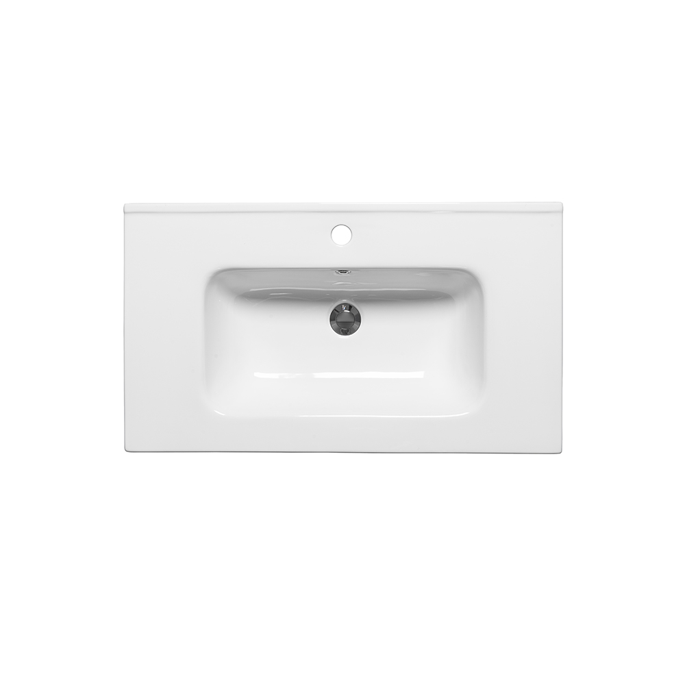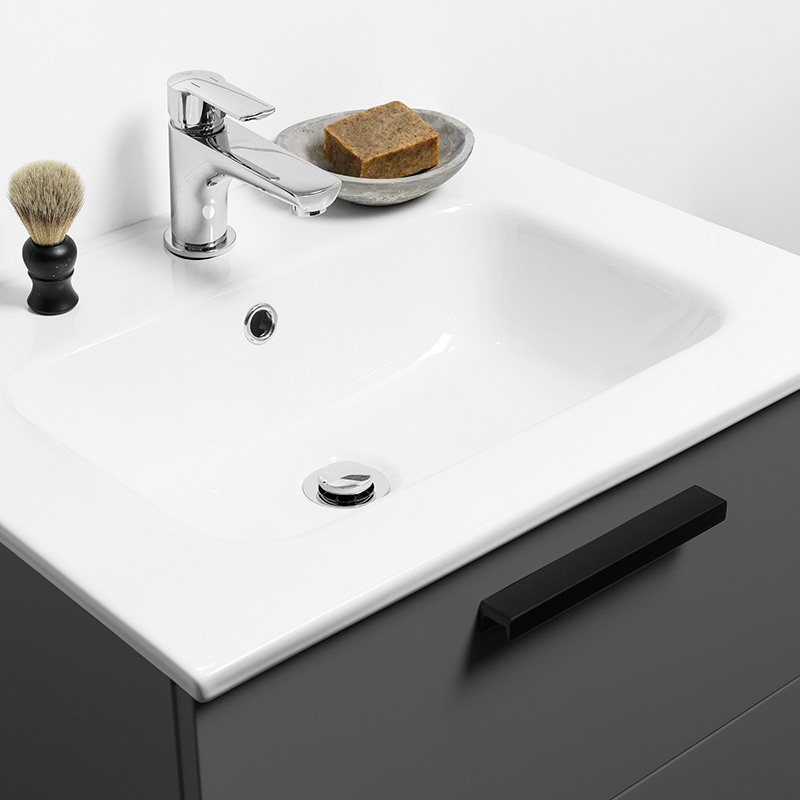Thin, spacious washbasin in porcelain with storage areas on the side.