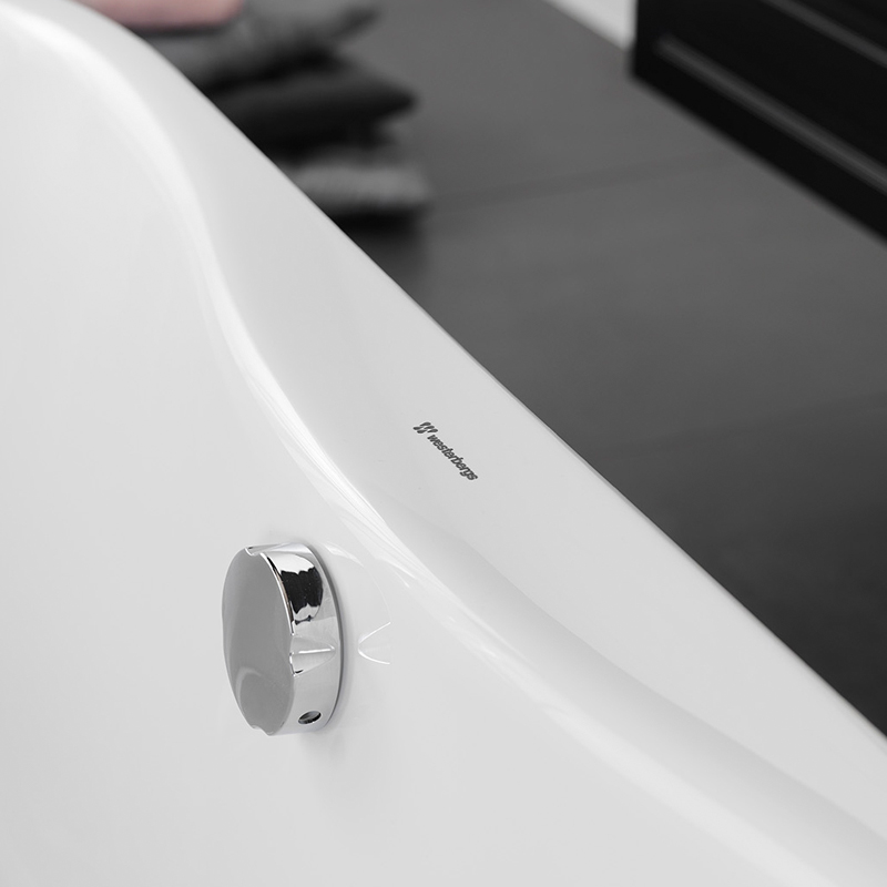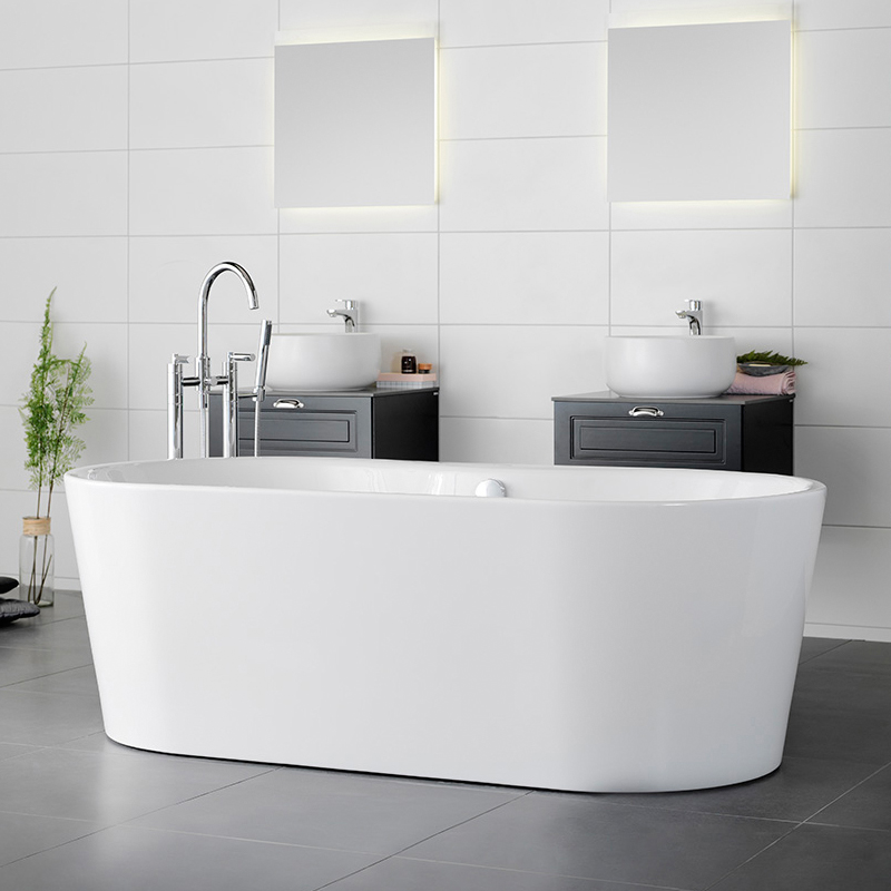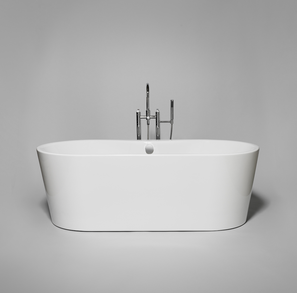A solid freestanding bath with exciting encounters between straight lines and curved shapes - a real eye-catcher in your bathroom. It is made of cast sanitary acrylic, with no visible joins and double walls to ensure good insulation so that the water retains heat for longer.