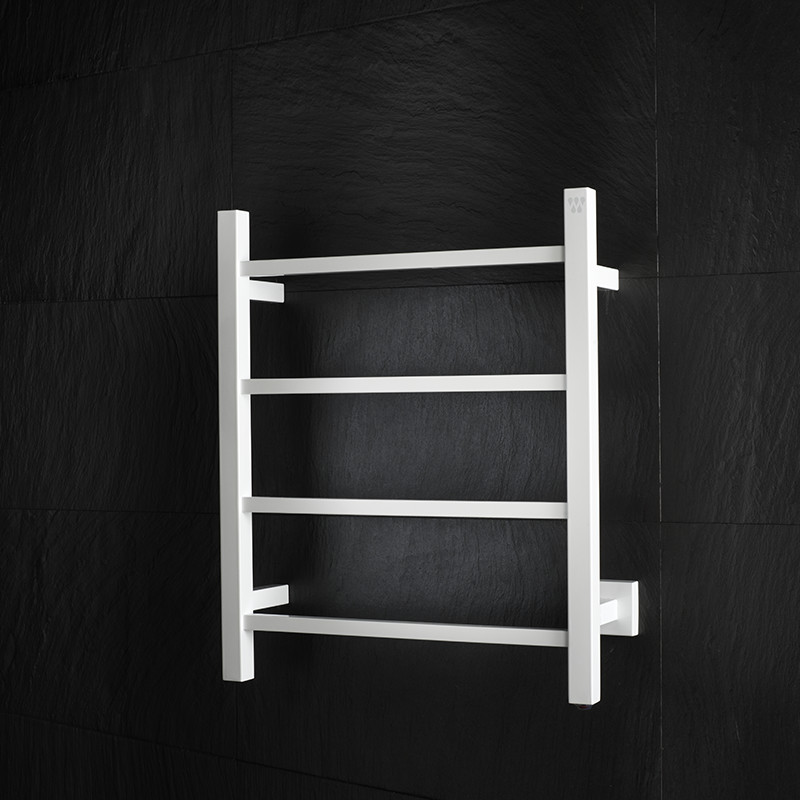 A towel rail in a streamlined design in white or stainless steel. With integrated electrical circuit and switch.